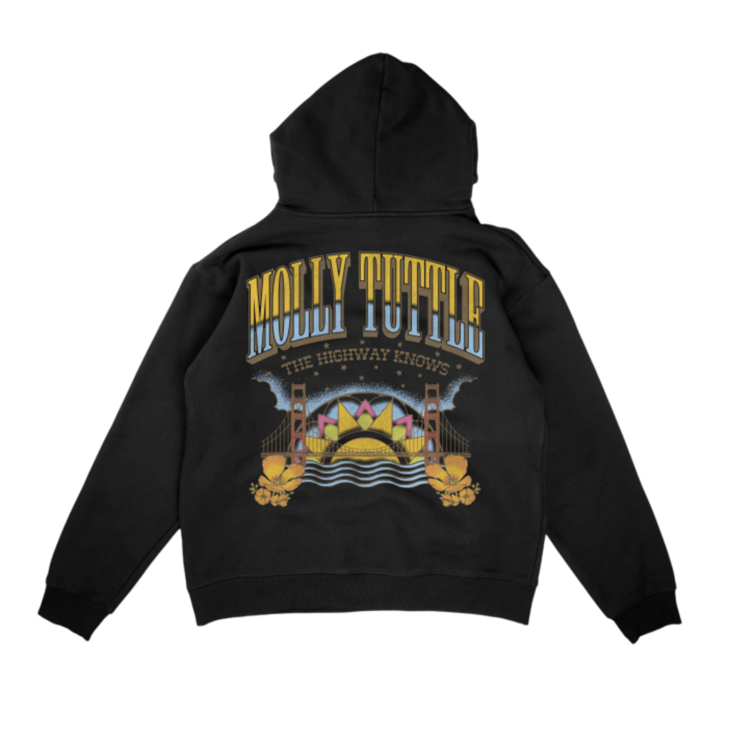 This black fleece lined hoodie has Molly Tuttle and The Highway Knows on the front left and fireworks over the golden gate bridge alongside Molly's lyrics printed prominently on the back.