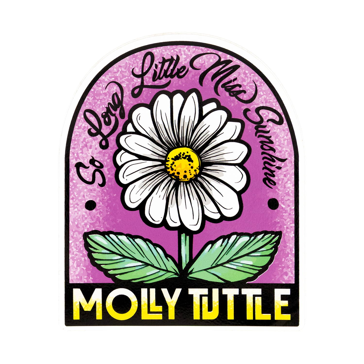 3" X 4" die cut sticker featuring a white flower and Molly Tuttle's name with So Long Little Miss Sunshine script across the top.